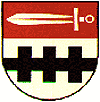 Das Wappenschild ist von Rot und Silber geteilt. Oben in Rot ein liegendes silbernes Schwert, unten in Silber ein oben und unten durchgehend dreifach gezinnter schwarzer Querbalken.